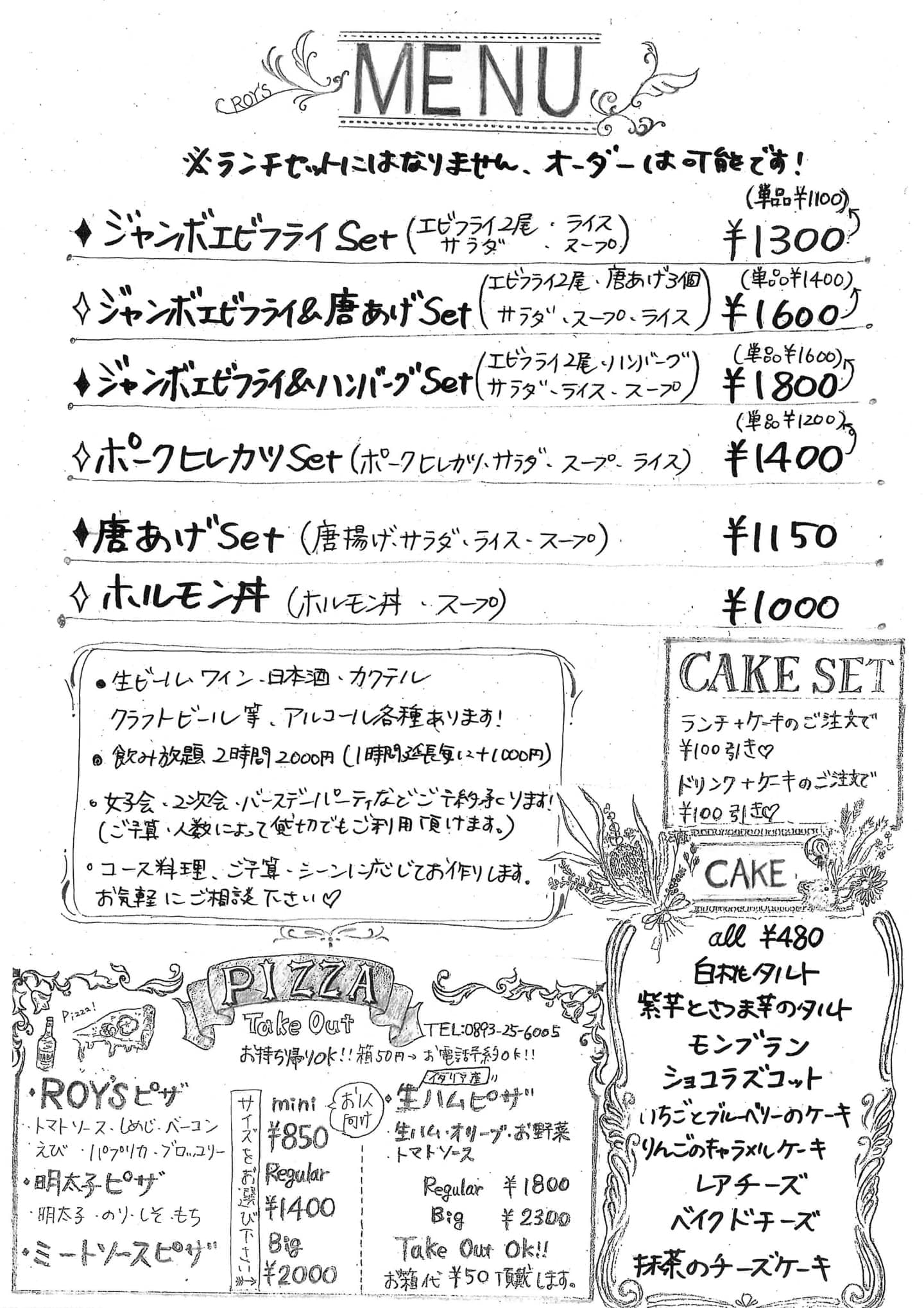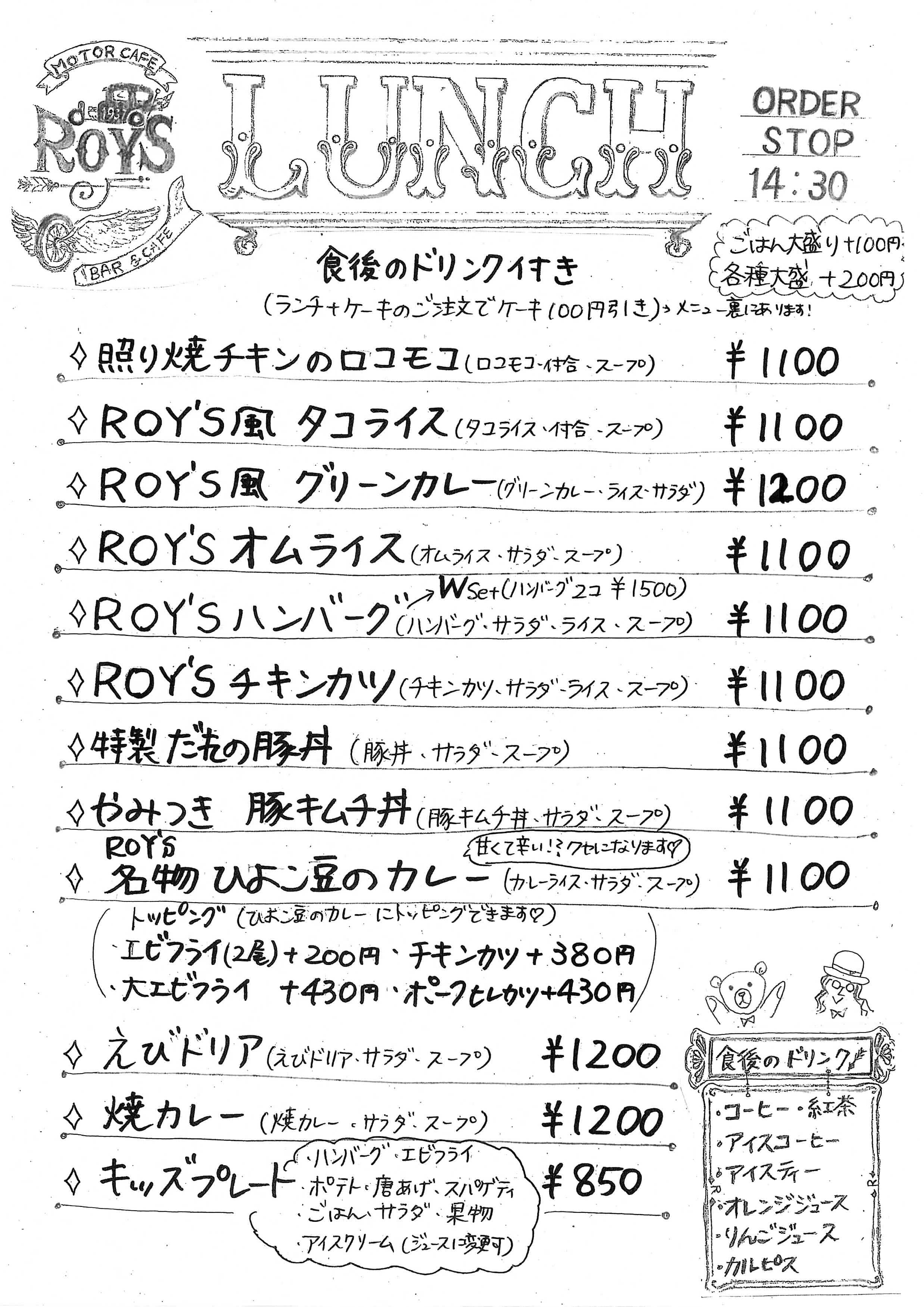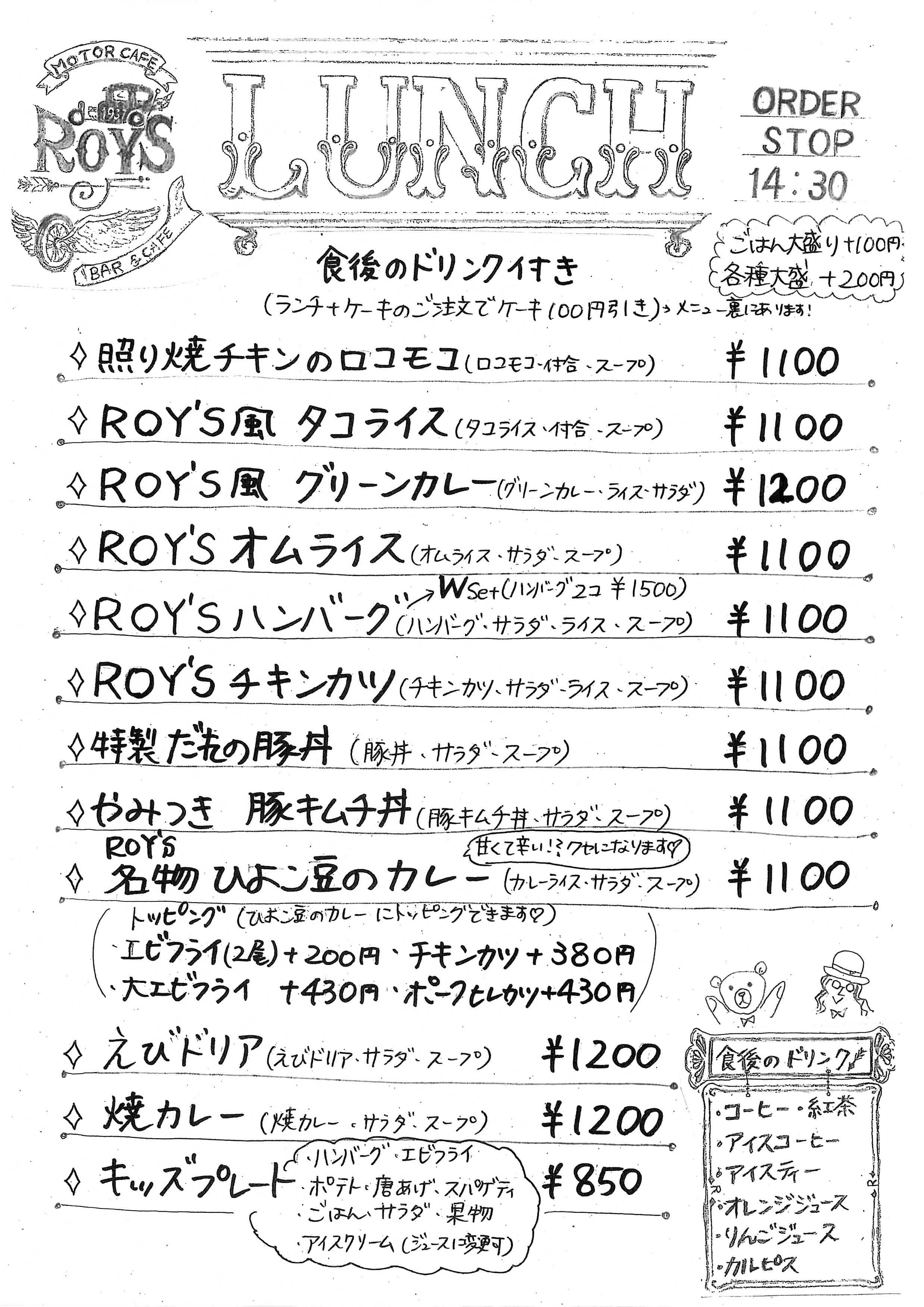 \当店おすすめ/ROY'S特製 ひよこ豆のカレー¥1,100 グリーンカレーの魚介付き+300円でグリーンカレーに魚介をトッピングできます※ランチタイムオーダー可 ROY'S オムライス¥1,100 〜Dinner Menu〜 (こちらは一例になります) 他、おつまみや定食・パスタなど各種メニュー取り揃えております 魚介のパエリア 鉄板ナポリタン ROY'S ハンバーグ チーズの盛り合わせ